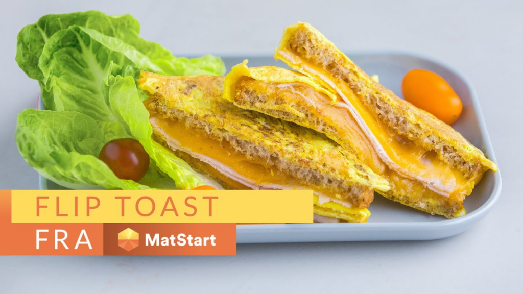 For å lage Flip Toast trenger du: 2 stk. Egg, 2 spiseskjeer vann, 1 klype salt, 1 teskje margarin, 2 brødskiver, 2 skiver cheddarost, 2 skiver kokt skinke.