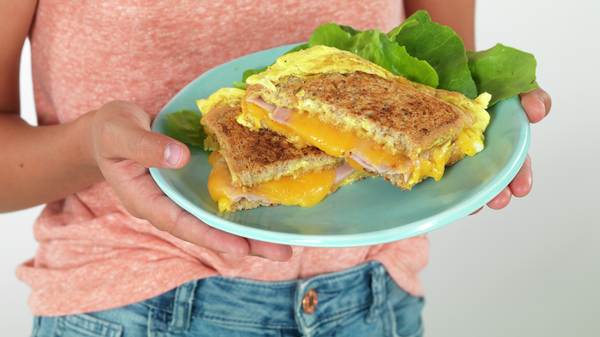 Fremgangsmåte: 1. knekk egg in en liten bolle. 2. ha vann i bollen. Bruk gjerne et målebeger eller et glass for å hente vann fra springen. 3. ha i salt. 4. visp sammen eggeblandingen med en gaffel. 5. sett stekepannen på platen og skru på middels varme. Ha i margarin. 6. når margarinen har sluttet å bruse er den klar for å stekes i. Legg i brødskiver, og stek til de får litt farge på undersiden. 7. snu brødskivene og stek til de har fått litt farge på den andre siden også. 8. hell de sammenvispede eggene over brødskivene i stekepannen. Stek til egget stivner. 9. legg på cheddarost. 10. Legg på skinkeskiver. 11. Flip den ene brødskiven over den andre. 12. Stek til osten er smeltet og alt egget har stivnet. Legg toasten over på en tallerken. Husk å skru av platen når du er ferdig. 13. Skjær gjerne toasten i to og spis den sammen med litt salat eller andre grønnsaker du liker.