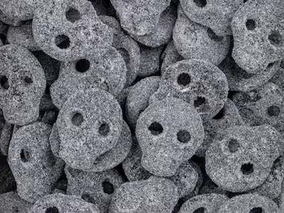 - Del soppene på midten. Skjær ut øyne med et metallsugerør, og lag nesebor og tenner med en kniv. Fordel hodeskalle-soppene utover skivene.