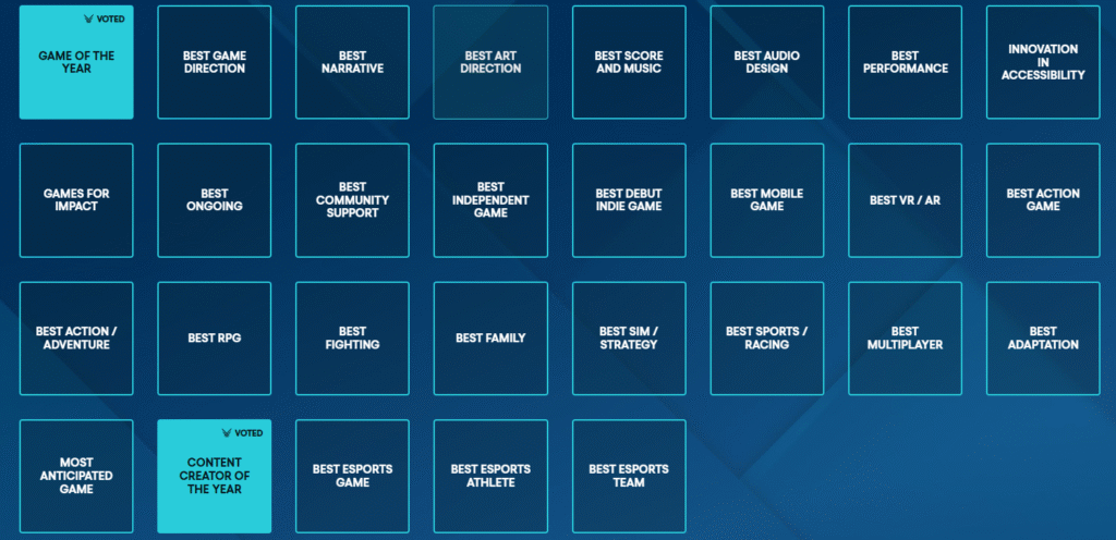 Game of the year Nominees er hva som skal bli velget av årets beste spill. Det er andre kategorier som kan vinne. Det er 6 som spill som kan vinne årets beste spill. Det er også mange kategorier de vinner ikke game of the year da. De er som for eksempel her på det bilde